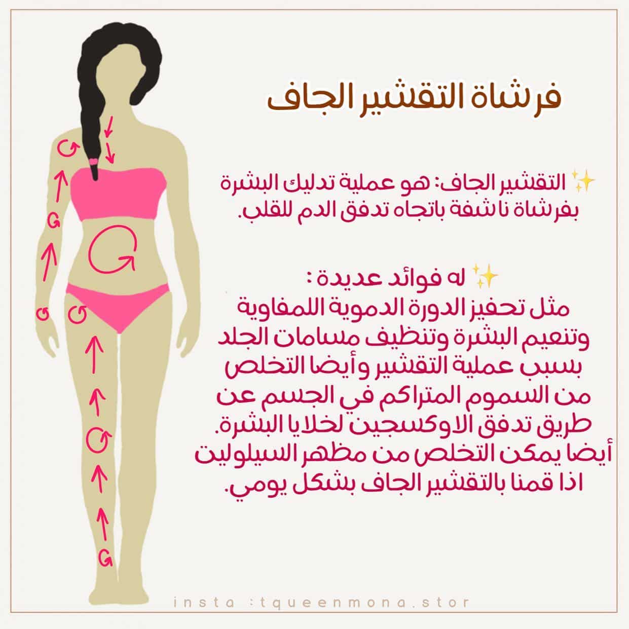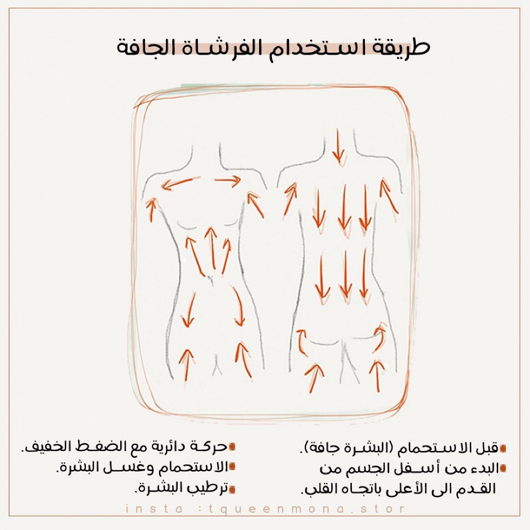 اول و اهم شيء انه جسمك يكون جاف غير مبلول و خالي من الزيوت ( بالفرشة ابدأي من تحت لفوق ) ابدأي من القدمين حتي الركب بضغط خفيف و تفريش من تحت لفوق في اتجاه القلب و فرشي المكان